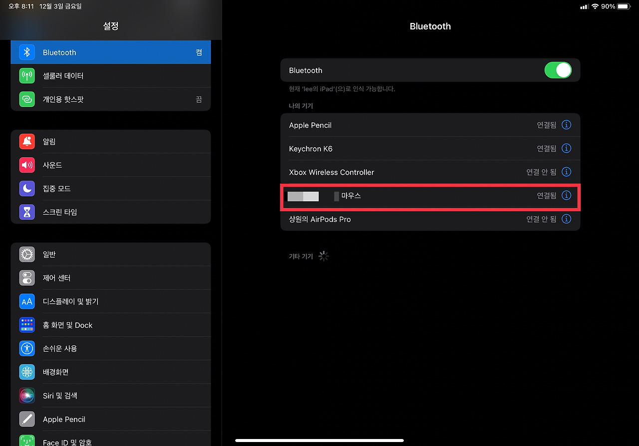 매직 마우스의 전원을 켜고 아이패드 프로의 [설정 > 블루투스]로 들어가면 아래와 같은 화면이 나온다.