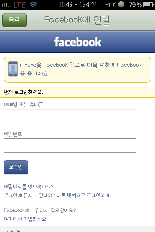 앱을 실행해 보니 로그인을 해야 이용할 수 있는 것으로 노출이 된다. 우선 구글 계정이 기억이 나지 않기 때문에 페이스북을 이용해서 로그인을 시도했다.