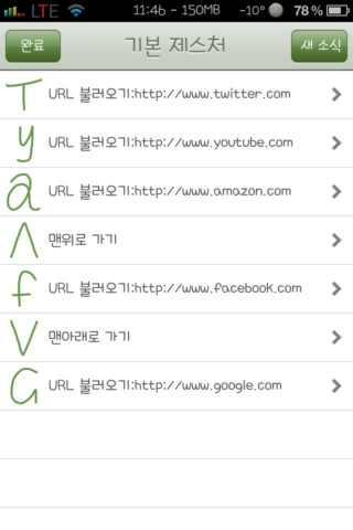 왼쪽 상단 화면을 보면 알 수 있겠지만 제스쳐 별로 URL 및 기능이 설정되어 있었다. 그동안 많은 제스쳐 지원 앱을 썼지만 이렇게 다양한 제스쳐는 처음이라 신기하면서도 놀랍다는 생각이 들었다. 추가로 더 신기했던 것은 이 제스쳐가 사용자에 따라서 임의로 추가가 가능하다는 것이었다.