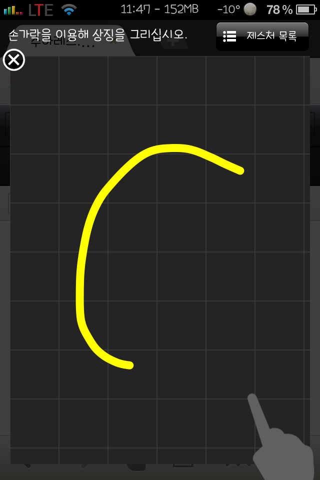 그러나 모든 것을 만족시킬 수는 없었을까? 아쉬운 것은 제스쳐를 하고자 한다면 오른쪽 상단에 캡처 되어 있는 것처럼 해당 창을 띄워야 가능했다. 웹페이지가 떠 있는 화면에서 그대로 제스쳐가 수행되었다면 얼마나 좋았을까 생각이 들었다. 개발사 입장에서는 입력 오류를 막기 위해서 였겠지만 제스쳐창을 완전히 새로 띄우는 것은 적응이 잘 되지 않았다.