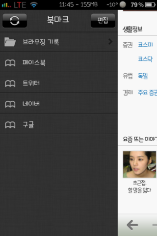 그리고 사용을 하다가 발견을 한 것이 있는데 왼쪽 사이드에서 안쪽으로 드래그를 하면 위와 같이 북마크가 노출된다. 이것을 확인하고 혹시나 해서 우측 사이드에서도 시도해 보았는데, 우측 제스쳐는 설정 및 제스쳐와 같은 메뉴들이 있었다. 브라우저에서 종종 사용되는 캐시삭제 메뉴도 있었다. 참고하자.
