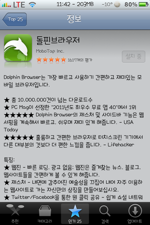 해당 앱은 안드로이드에서도 꽤 인기가 있었던 모양인데, 이번에 그 인기에 힘입어 앱스토어에도 출시를 하게 되었다. 그런데 기존 브라우저들을 넘어 별점 5개를 기록하고 있다. 1,617개의 평가인데 별점이 5개를 유지하는 것을 보니 상당히 괜찮은 앱인가보다. 이러한 별점과 리뷰들을 보니 설치를 안해 볼 수가 없다.
