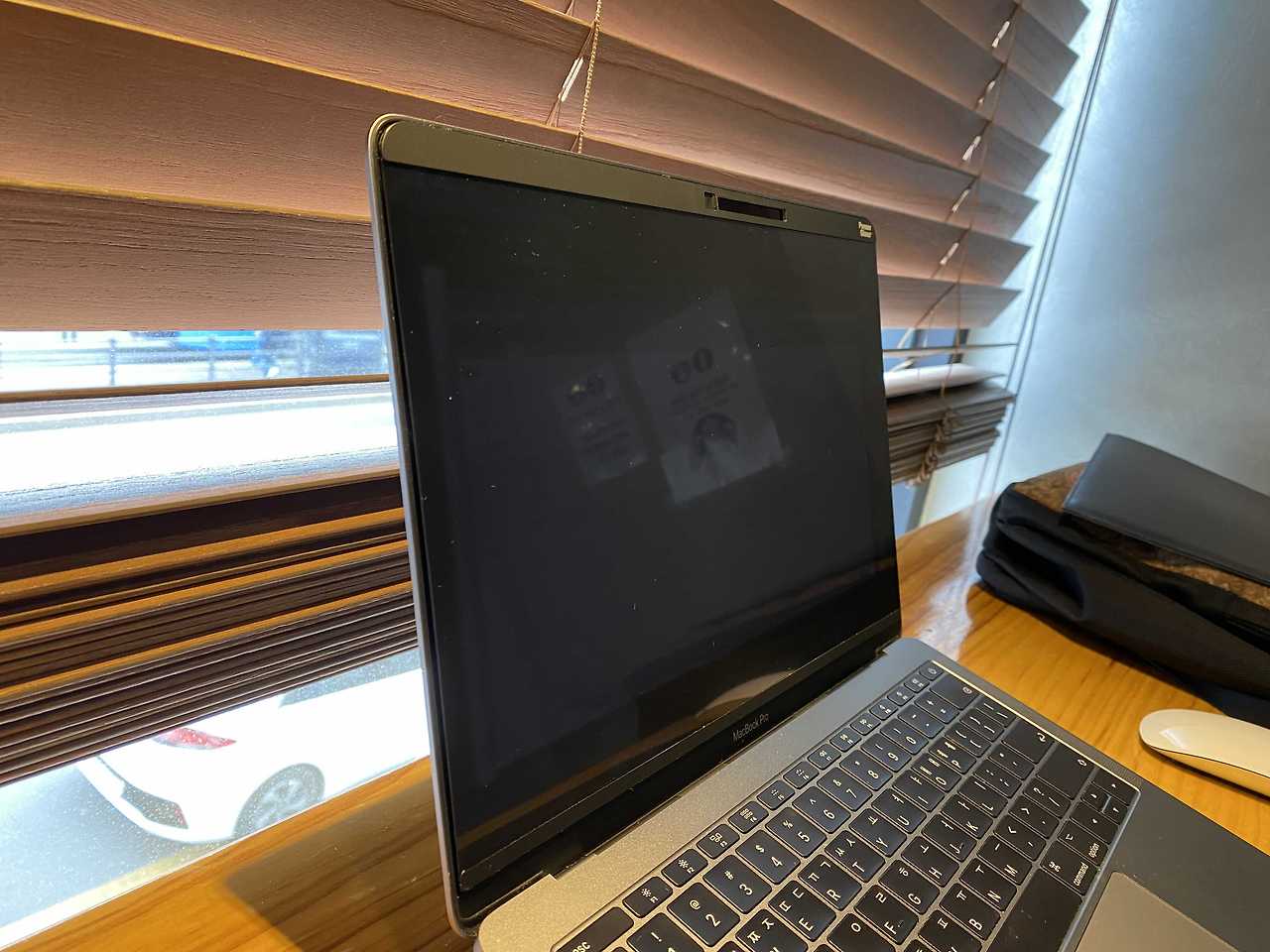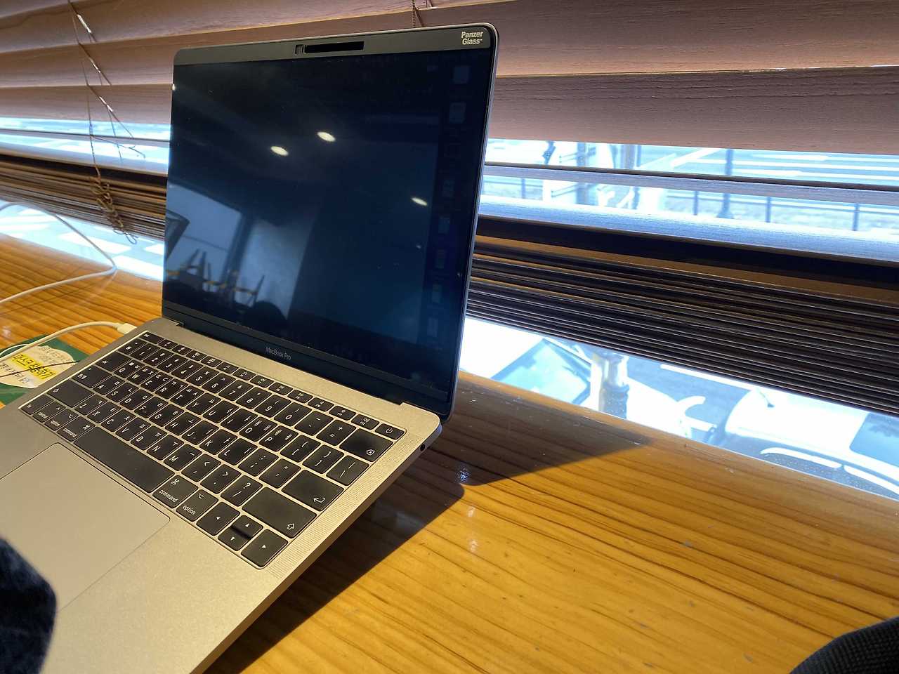 맥북이 가장 이뻐 보일 자리에 자리를 잡은 뒤 맥북을 꺼내고 위와 같이 판저 글라스를 장착해 보았다. 화면에서도 보이듯이 착용 시 살짝 어두워진다. 하지만 사용하지 못할 그럴 정도의 어두워짐은 아니다. 하지만 쨍한 화면을 좋아하는 사람들에게는 걸러야 하는 이유가 될 수도 있다.