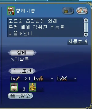 지난번에 보여 준 적이 있는 필자의 월광 윈드 재머의 경우 배의 스킬로 급가속, 고층 감시대, 증기기관이 달려 있는데, 이것들도 위에 기재한 스킬들을 요구한다. 현재 필자에게 필요한 것은 항해기술과 관리 기술이다. 그 가운데 오늘 배우고자 하는 것은 아래의 항해기술이다.
