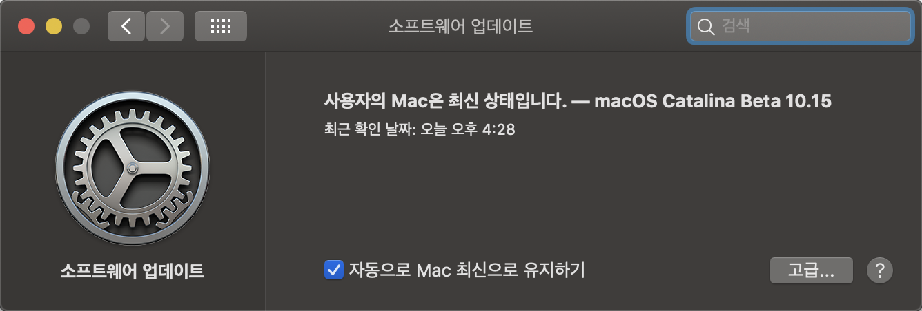 뭐 변경 사항은 여러 블로그에서 다루고 있기 때문에 여기서는 다른 블로그에서 다루지 않는 내용에 대해서 다뤄보고자 한다. 2019년 10월 08일에 Catalina OS 정식 버전이 업데이트되었다. 기존에 베타 버전을 사용하지 않던 사람들의 경우는 Mojave에서 시스템 업데이트를 통해서 업데이트를 하고 사용하면 된다. 하지만 기존에 베타를 사용하던 사람들의 경우 아래와 같은 메시지의 업데이트 창을 볼 수 있다.