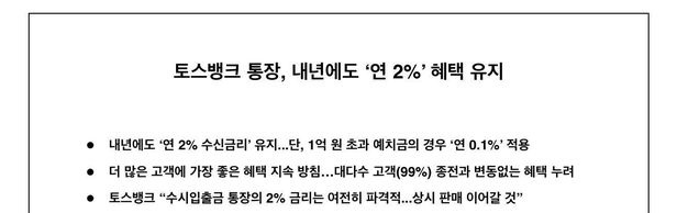토스뱅크는 이날 위와 같은 금리 변경 자료를 내면서도 제목을 ‘내년에도 연 2% 혜택 유지’라고 달았지만, 결국은 1억원을 초과하는 예금엔 이자를 거의 주지 않겠다는 내용으로 다른 시중 은행들과의 경쟁력에 있어 별다른 차이가 없어졌다. 다만 1억원 이하 예금자들의 경우는 지속적으로 2% 이율을 받을 수 있으며, 이자 지급 방법도 기존과 동일하게 유지 된다. 이 이자 지급 방식은 토스 뱅크 통장의 장점 중 하나로 예치 기간이 정해져 있는 시중은행의 일반 예·적금 상품과 달리 수시입출금 상품으로, 고객이 단 하루만 돈을 맡겨도 이자를 받을 수 있다. 고객은 맡긴 금액과 그 기간에 따라 매월 셋째 주 토요일에 이자를 일할 계산해 지급 받을 수 있다.