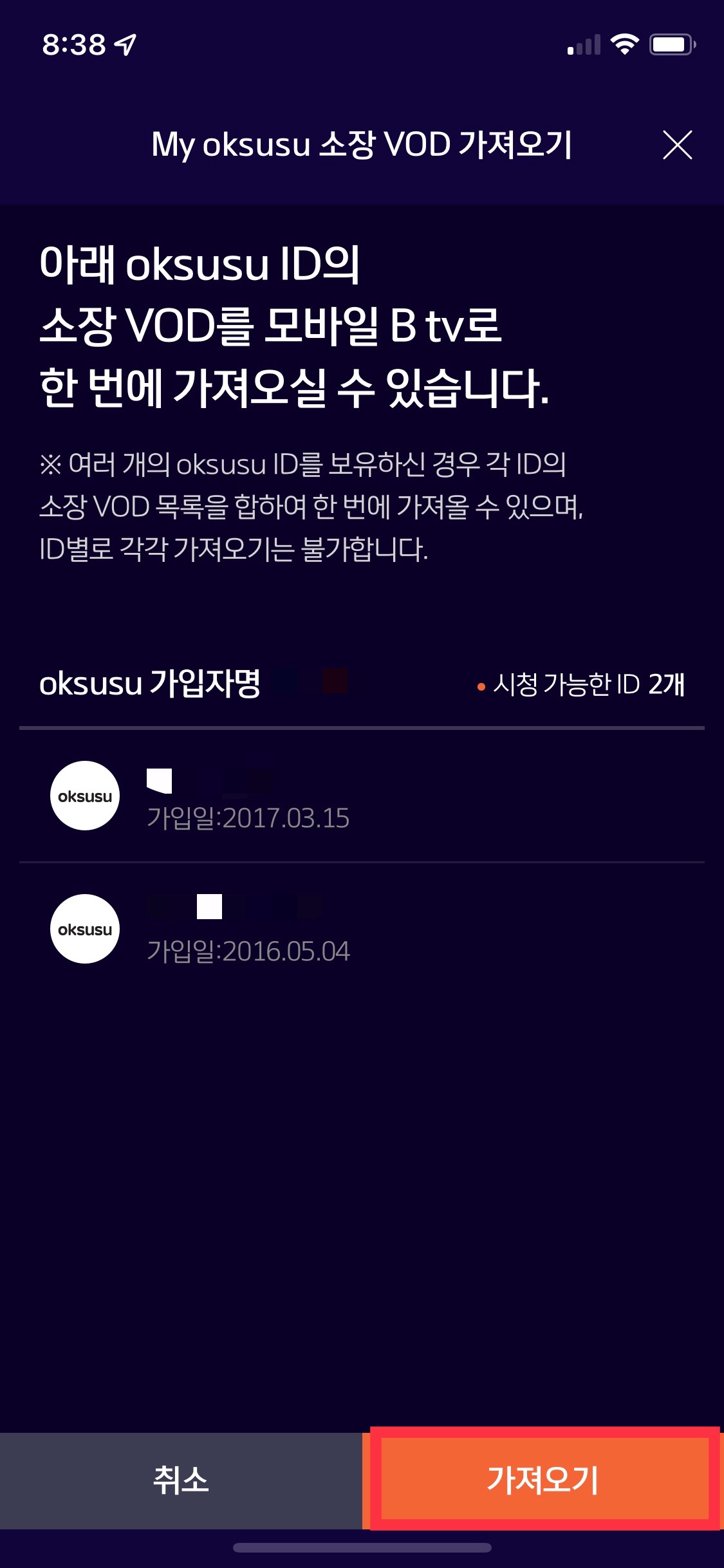 인증을 마치게 되면 아래와 같이 옥수수에 가입했던 아이디 및 정보들이 간략히 나오게 되는데, 가져오기를 선택하면 되겠다.