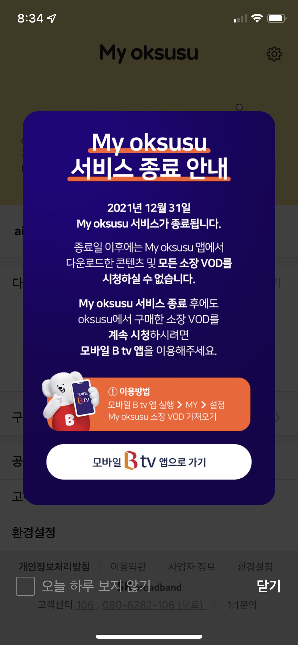 마이 옥수수 어플이 21년 12월 31일 부로 서비스가 종료된다는 팝업이다.