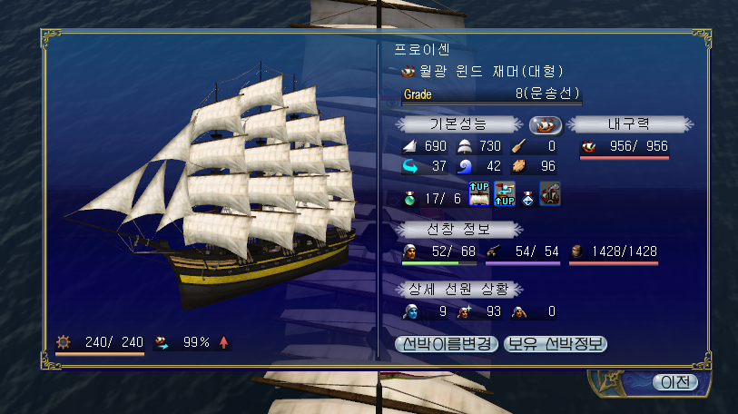 배의 종류는 기재된 것처럼 월광 윈드 재머라는 배인데 리스본 <-> 암보니아를 왕복하는데 순풍만 잘 만나면 그래도 21 knots 이상의 속도가 나와 주기에 배에 더 욕심은 나지 않는다. 그 위로 갤리선이나 기타 더 높은 Grade의 함선들이 있지만 그것은 나에게는 욕심과도 같다고 본다. 이 정도면 정말 적당하다.