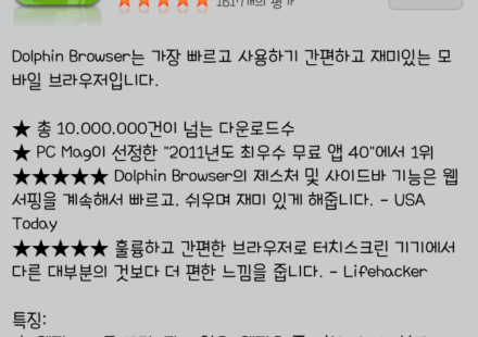 오늘은 돌핀 브라우저라는 앱을 들고 왔다. 먼저 사진 한장 보고 시작하자. 해당 앱은 안드로이드에서도 꽤 인기가 있었던 모양인데, 이번에 그 인기에 힘입어 앱스토어에도 출시를 하게 되었다. 그런데 기존 브라우저들을…